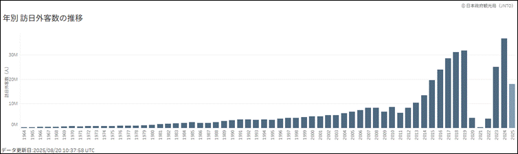 外国人タクシードライバーの受け入れが進む要因の一つに、訪日外国人観光客の急増があります。日本政府観光局(JNTO)の発表によると、2024年には訪日外客数が年間で過去最高の3,686万9,900人を記録しました。