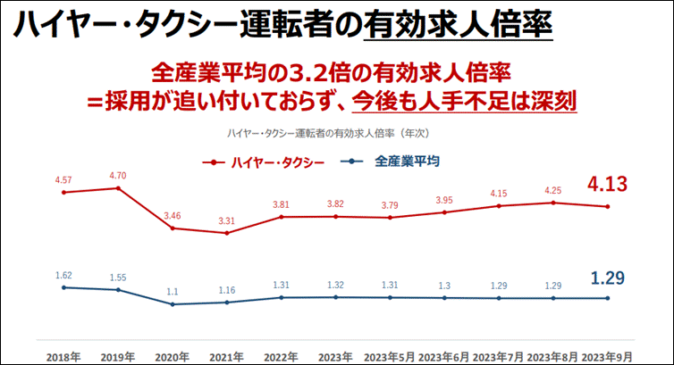 タクシードライバーの有効求人倍率は高い水準で推移しており、業界の人材獲得競争の厳しさを示しています。2023年9月時点での有効求人倍率は4.13倍に達し、全産業平均の1.29倍を3倍以上も上回る異常事態です。