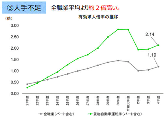 物流業界では、長年にわたり慢性的な人手不足が問題となっています。特にトラックドライバーの有効求人倍率は2.14倍と、全職業の1.19倍を大きく上回る高水準で推移しており、必要な人材を確保するのが難しい状況です。