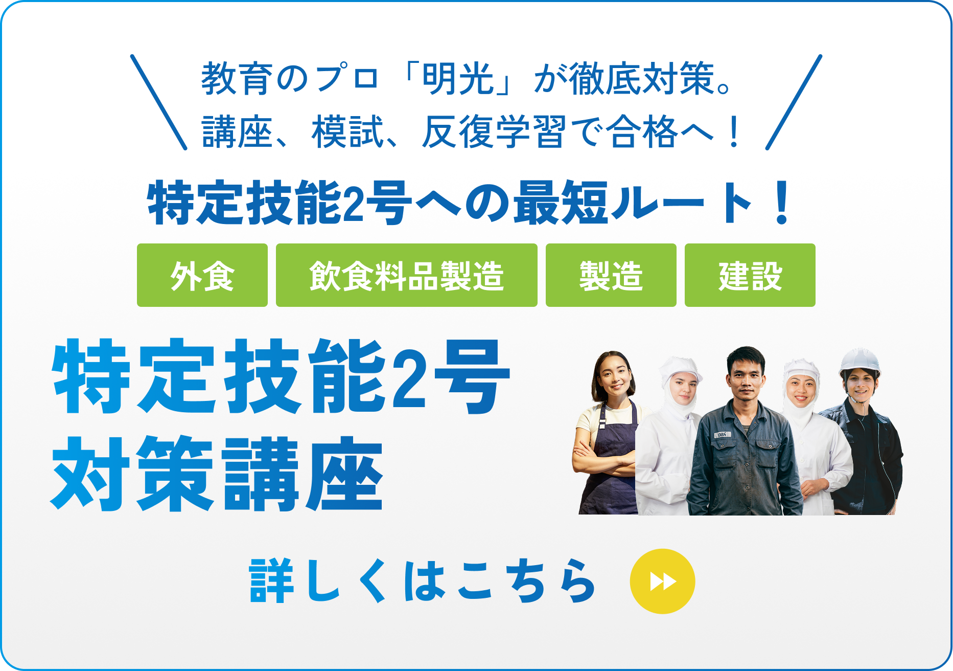 合格を目指すには、専門的な指導を受けられる教育機関のサポートを検討することも必要になります。次の章では、特定技能2号試験対策に特化したプログラムを提供している「明光グローバル」についてご紹介します。