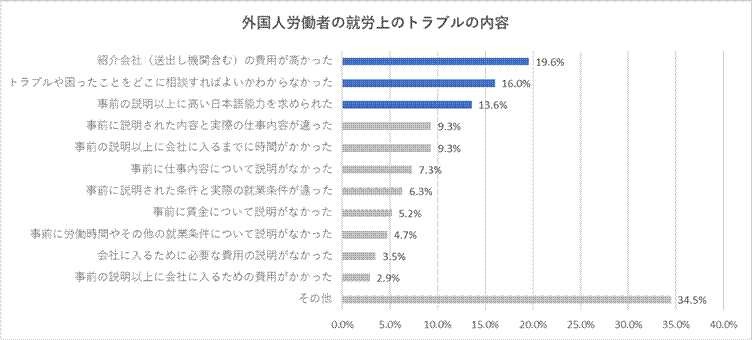 厚生労働省が公表している「令和5年外国人雇用実態調査」によると、外国人労働者のうち14.4%が就労上のトラブルを経験しています。特に多くの外国人労働者が経験したトラブルとしては「紹介会社(送出し機関を含む)の費用が高かった」「トラブルや困ったことをどこに相談すればよいかわからなかった」「事前の説明以上に高い日本語能力が求められた」などが挙げられます。