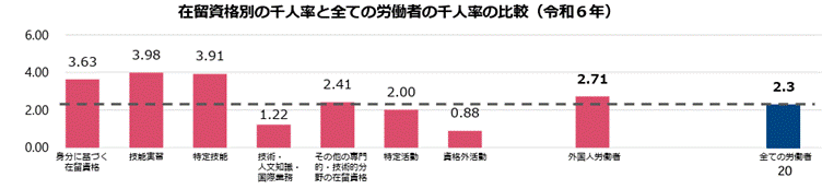 厚生労働省の2024年の調査によると、外国人労働者の労働災害発生率である死傷年千人率(以降「千人率」)は、日本人を含むすべての労働者より高くなっています。近年、外国人労働者に対して、安全教育が十分に行われず、就業中に労働災害が発生する事例が多く発生しています。