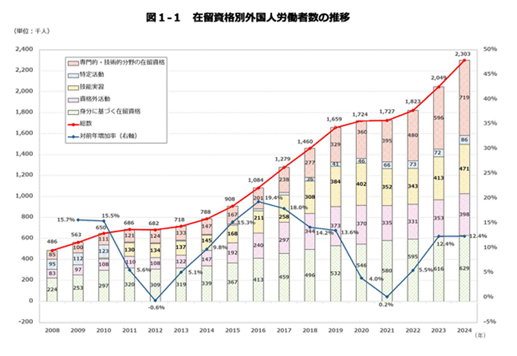 画像引用元:「外国人雇用状況」の届出状況まとめ(令和6年10月末時点)(厚生労働省)