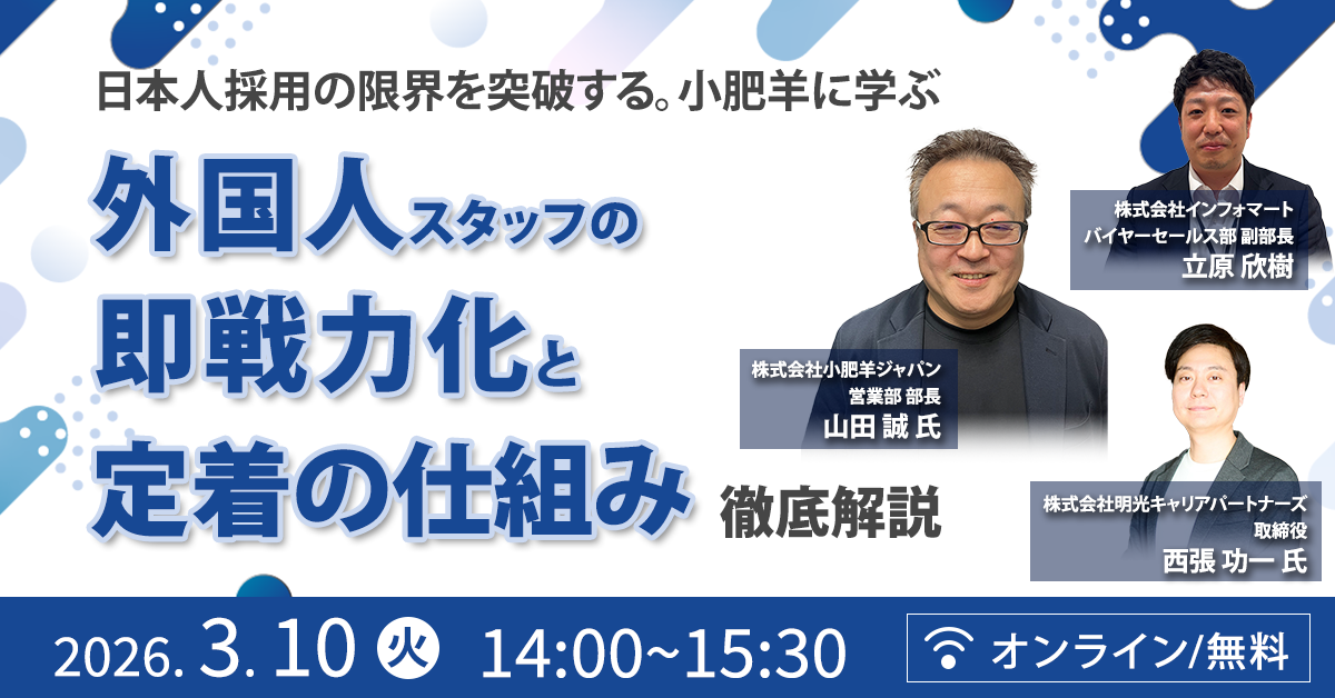 本セミナーでは、火鍋専門店「小肥羊ジャパン」のご担当者をお招きし、「明光キャリアパートナーズ」による質の高い母集団形成と、「インフォマート」による多言語教育の仕組み化を組み合わせることで、現場の教育体制をどのように整え「高品質なサービス」を実現しているのかを具体的事例とともに解説します。